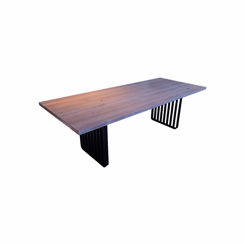 Der Esstisch „LAMELLO“ von KFF verbindet zeitloses Design mit hochwertigen Materialien. Die rustikal brettverleimte Tischplatte aus weißgeölter Eiche bringt natürliche Wärme in den Essbereich, während das schwarz strukturierte, pulverbeschichtete Stahl-Wangengestell für einen modernen, klaren Kontrast sorgt. Mit seinen großzügigen Maßen bietet dieser Designer-Esstisch viel Platz für gesellige Runden und wird zum stilvollen Mittelpunkt des Raumes.