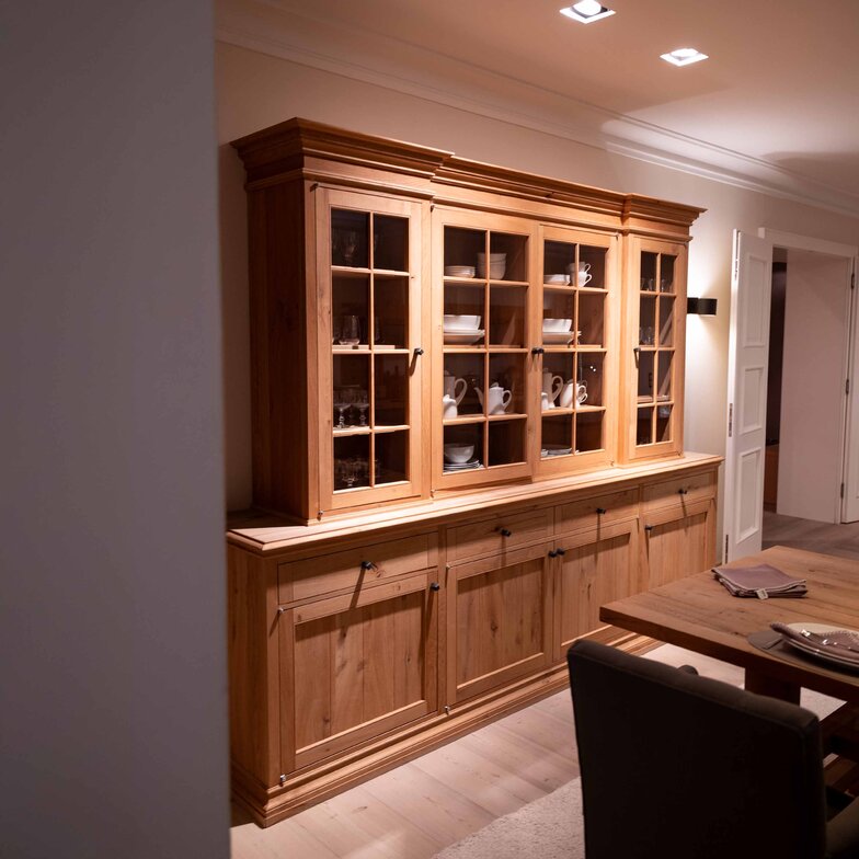 Die Kredenz „LANDART“ aus unseren Wetscher Werkstätten vereint hochwertige Handwerkskunst mit zeitlosem Design. Die Anrichte bietet viel Stauraum, während die Kombination aus Glasfüllungen, Holzsprossen und Eiche Altholz außen sowie Wildeiche innen natürliche Wärme und Charakter verleiht. Diese Kredenz ist ein Unikat und in reiner Handarbeit in unserer Werkstätte hier in Fügen gefertigt - ein Möbelstück, das sowohl durch Qualität als auch durch Stil überzeugt.